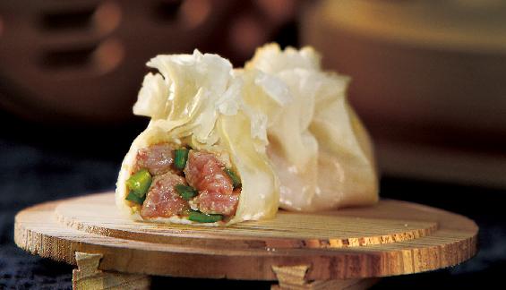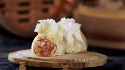 一籠燒麥稱一兩, 一壺磚茶涮肚腸; 皮薄餡大滋味足, 油煎熱蒸鮮嫩香。
